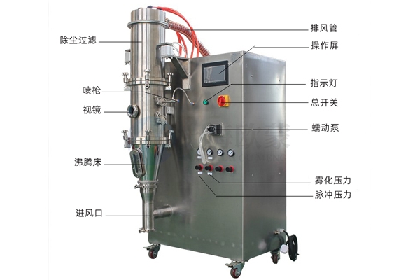 物料在潔凈的熱氣流(負(fù)壓)作用下懸浮形成流化狀態(tài),其表面與熱空氣完全接觸,受熱均勻,達(dá)到了熱交換狀態(tài),從而有著極高的效率。配上合適的噴霧系統(tǒng),以及進(jìn)一步的流化床功能結(jié)構(gòu)改進(jìn)后,更加貼切地表現(xiàn)出流化床噴霧干燥制粒、包衣的特性,即成為一種兼具干燥、造粒、包衣的多用途工藝設(shè)備。